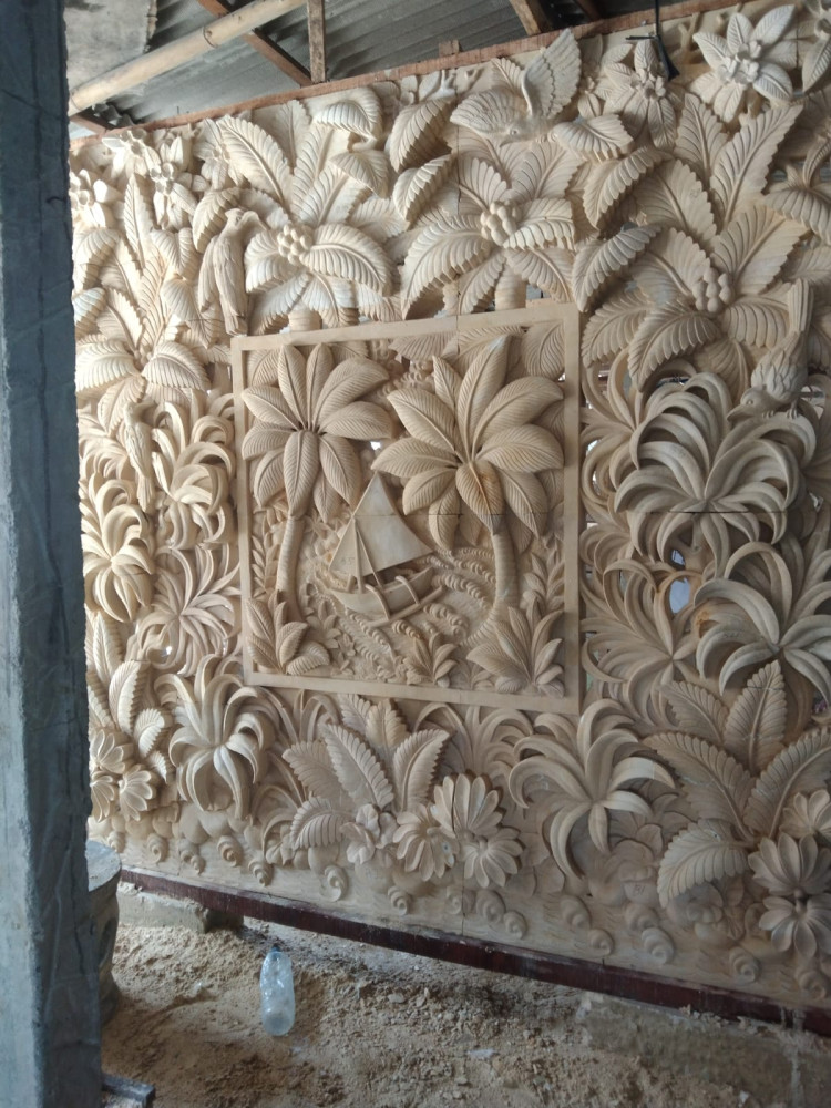 Relief burung dan alam ini merupakan representasi memukau dari kekayaan ekosistem hutan yang dituangkan ke atas batu. Komposisinya memenuhi seluruh permukaan dinding dengan prinsip horror vacui, di mana setiap celah diisi oleh rimbunnya dedaunan, sulur tanaman, dan buah-buahan hutan yang detail. Figur sepasang burung merak berdiri menonjol dengan teknik high-relief, memberikan efek bayangan yang dramatis saat terkena sinar matahari, yang mempertegas tekstur helai bulu ekor yang menjuntai serta liukan leher mereka yang anggun di antara pepohonan.