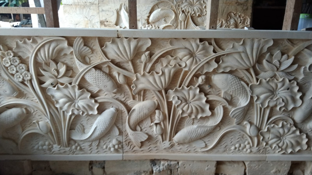 Relief ini menampilkan sembilan ekor ikan koi yang dipercaya sebagai simbol keberuntungan dan kemakmuran. Mengikuti prinsip horror vacui, seluruh bidang batu dipenuhi dengan ukiran bunga seroja dan bebatuan sungai yang artistik tanpa menyisakan ruang kosong. Ikan-ikan tersebut tampil dominan melalui teknik high-relief, menciptakan dimensi yang kuat yang mempertegas kibasan sirip yang lebar serta ekor yang menjuntai halus, seolah-olah ikan tersebut sedang berenang keluar dari permukaan batu.