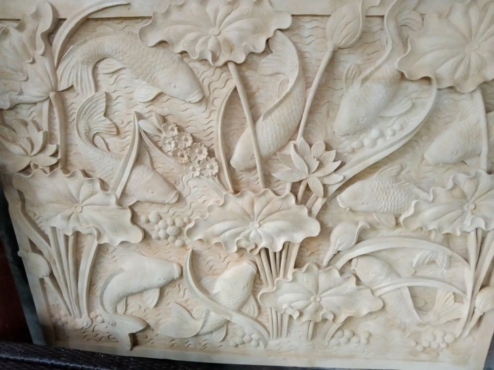 Relief ini menangkap momen kehidupan di bawah permukaan air dengan sangat detail dan hidup. Sesuai dengan prinsip horror vacui, seniman mengisi setiap sudut relief dengan tekstur lumut, kerikil, dan tanaman ganggang yang meliuk. Figur ikan koi yang sedang melompat ke permukaan air dipahat dengan teknik high-relief, memberikan efek visual yang dramatis saat tertimpa cahaya, yang mempertegas anatomi kepala ikan yang kuat serta percikan air yang tampak realistis meskipun terpahat pada media yang kaku.