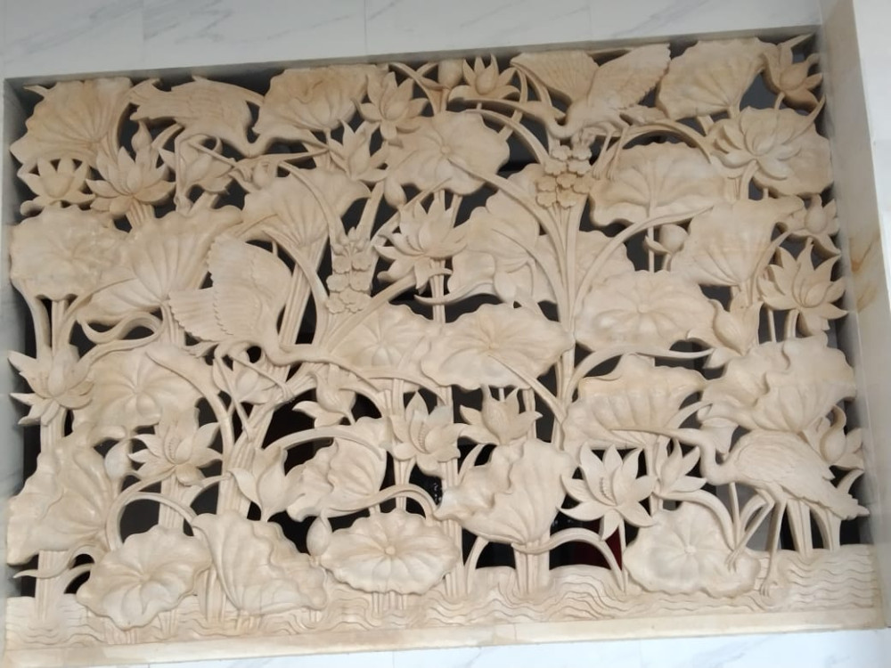 Relief ini menampilkan vegetasi kolam yang rimbun, menciptakan suasana alam yang asri dan padat. seluruh bidang batu dipenuhi dengan ukiran batang-batang lotus yang saling bersilangan dan akar yang menjalar di dasar telaga. Kelompok bunga lotus tampil dominan melalui teknik high-relief, menciptakan dimensi visual yang kuat yang mempertegas tekstur urat pada daun yang lebar serta bulir air yang tampak berkilau, memberikan kesan hidup pada material batu yang kaku.