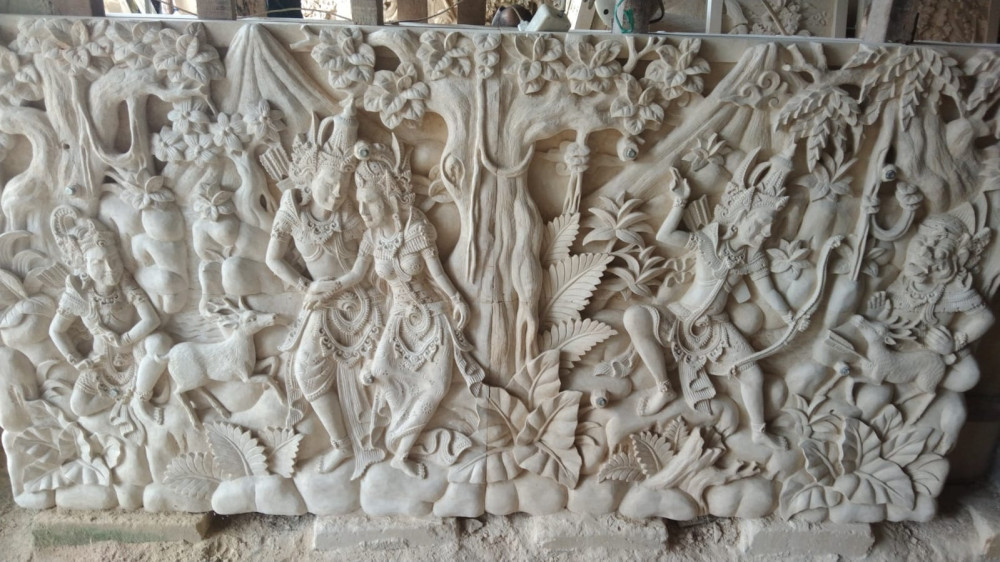 Relief ini menangkap adegan heroik saat Hanoman, sang kera putih, memberikan cincin milik Rama kepada Sinta yang sedang tertawan di taman Argasoka. Figur Hanoman dipahat dengan posisi berlutut yang penuh hormat, memperlihatkan detail bulu-bulu halus dan otot tubuh yang lincah. Latar belakangnya dipenuhi oleh ukiran pohon Nagasari yang sedang berbunga dan penjagaan ketat para raksasa yang tampak tertidur, memberikan kedalaman ruang yang nyata dan mempertegas suasana harapan di tengah penantian Sinta.